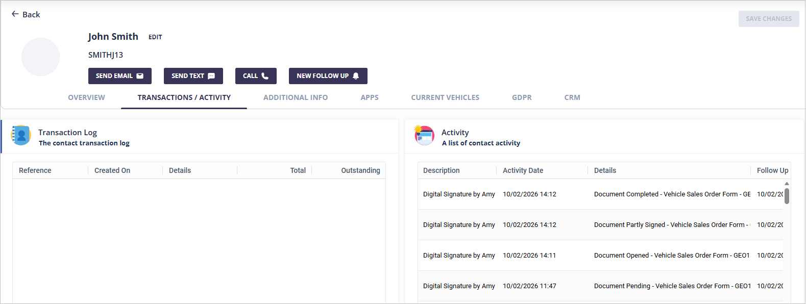 There is a log of all digital signature forms sent to a customer in their contact record. The details will display the status of the document: