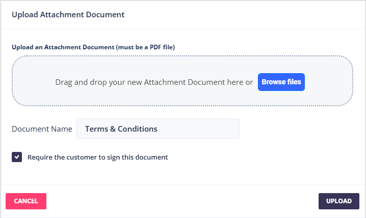 Click on New Attachment and browse for the pdf document, then indicate if you want the customer to sign the document. Signed documents will be included in the digital envelope and un-signed documents will be added as an attachment to the email that is sent.