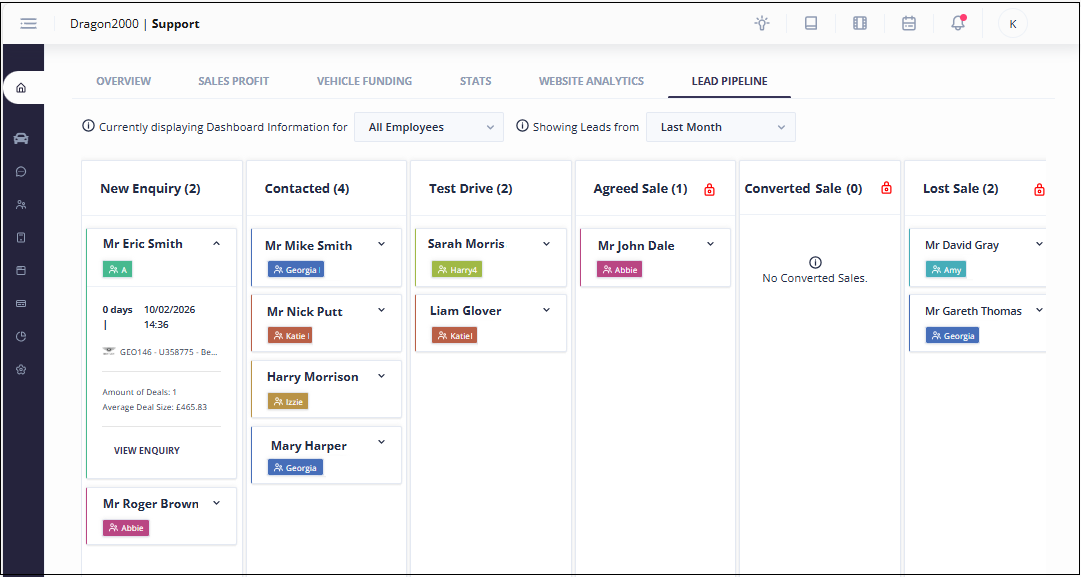 Pipeline Stages – Drag and drop cards between the open stages (New Enquiry, Contacted & Test Drive).