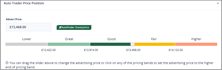 Use the slider to set your Advert price, or to maximise the price you ask for the vehicle, while still keeping within a specific band, click on the upper price of the band.