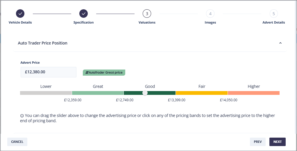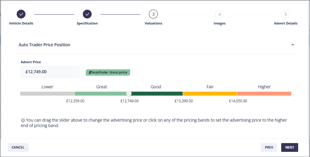 Use the slider to set your Advert price, or to maximise the price you ask for the vehicle, while still keeping within a specific band, click on the upper price of the band.