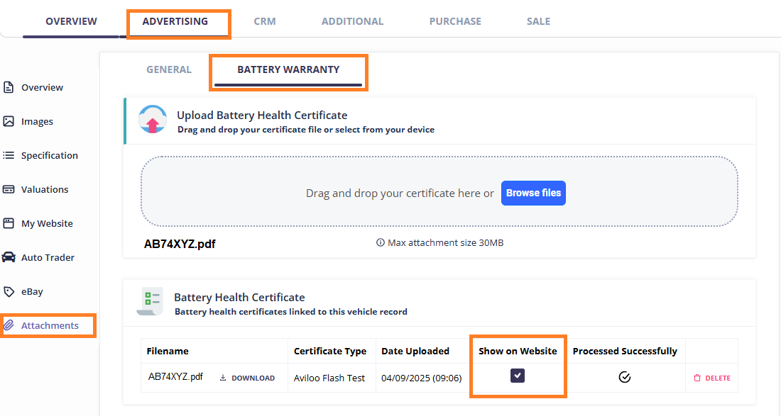 Car dealers that sell electric vehicles can signup to AVILOO through MotorCheck can quickly and reliably check the condition of their EV and PHEV stock by simply plugging AVILOO’s battery checker unit directly into their car on the forecourt. The test takes just 3 minutes to complete, generating a certificate detailing the battery health. This document can be uploaded to the vehicle record in Dragon2000 Portal.