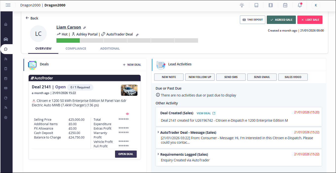 Vehicle Enquiry – a lead record is created in DragonPortal with a vehicle interest and a deal for that vehicle.