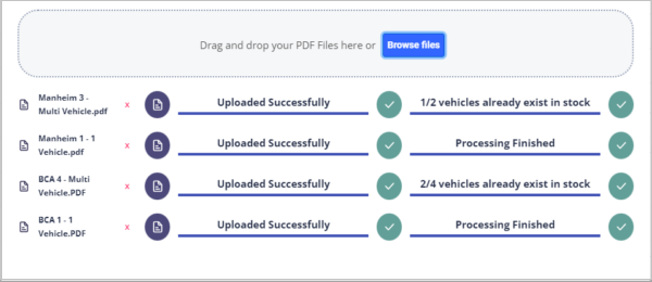 The uploader will confirm once the invoices have finished processing. If any vehicles already exist in stock, a record will not be created.