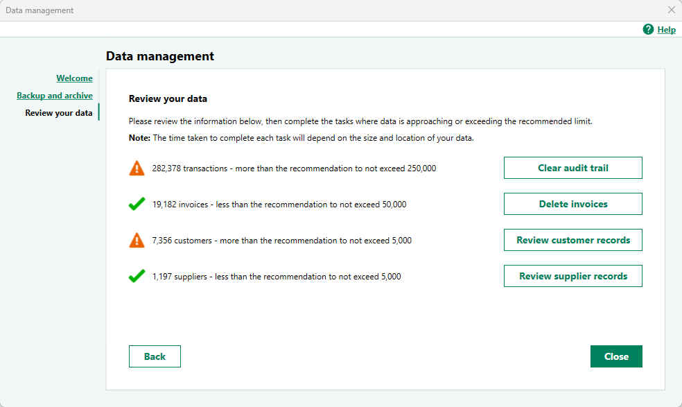 Having taken a backup, you will be presented with suggestions to get your data back within the recommended data limits.